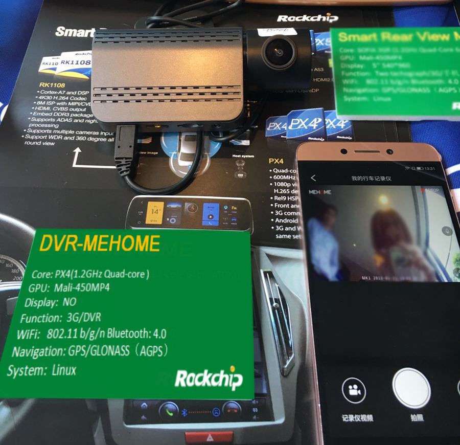 Rockchip高階PX4車聯(lián)網(wǎng)方案,四核處理器,Mali-450GPU,助力車聯(lián)網(wǎng)產(chǎn)品全面升級。本次展出了搭載PX4方案的行車記錄儀,基于Linux系統(tǒng),支持前后1080P+720P雙錄、網(wǎng)絡(luò)在線直播、Wifi無線透傳,時(shí)延200ms內(nèi)、BT4.0抓拍按鍵、GPS軌跡追蹤、優(yōu)秀的功耗控制;可通過手機(jī)APP觀看實(shí)時(shí)或錄制影像。