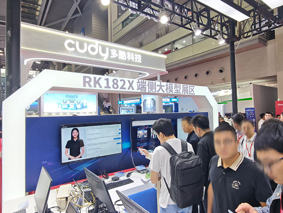 端側(cè)大模型展區(qū),展出RK182X端側(cè)AI算力協(xié)處理器及系列相關(guān)應(yīng)用。RK182X具備大算力、高帶寬特性,支持3B/7B大模型突破百token/s輸出,可根據(jù)算力需求疊加一個或多個RK182X協(xié)處理器,為終端設(shè)備提供前所未有的算力靈活性,針對端側(cè)AI復(fù)雜計算需求,特別是在多路視覺分析領(lǐng)域如智能安防、智能社區(qū)、智能校園等提供安全、可靠、低成本的AI部署選擇。