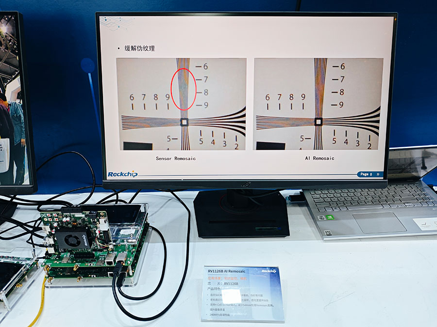 作為本次的重磅新品,瑞芯微新一代4K機器視覺芯片RV1126B備受關(guān)注。RV1126B具備3T強勁算力,可運行2B以內(nèi)規(guī)模的大語言模型及多模態(tài)模型,針對算力、AI-ISP、AOV3.0、超級編碼、防抖等性能均有明顯升級。現(xiàn)場演示了多項引領(lǐng)行業(yè)的技術(shù)應(yīng)用,賦能各類視覺設(shè)備實現(xiàn)從“看得見”到“看得懂”的質(zhì)的飛躍: